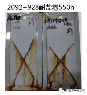 Banco 928良好的盐雾,耐化学品性能也是必不可少的要求,相对于传统水溶型固化剂,更加疏水,因此耐盐雾性能更加优异,特别针对环氧体系中普遍耐酸性差,耐5%硫酸可以达到48h,具体耐性测试数据如下表:
