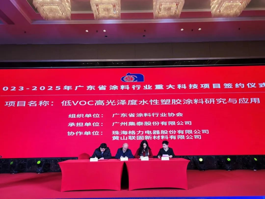 会议期间,举行了隆重的《2023-2025 广东省涂料行业重点科技项目》签约仪式。联固新材料作为涂料行业优秀的水性聚合物原材料供应商,与珠海格力电器、广州集泰股份正式签约,在“低VOC高光泽度水性塑胶涂料研究与应用”科技项目上协同创新,共同解决行业技术难题。